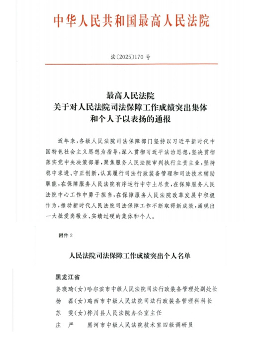 近日,最高人民法院印发《关于对人民法院司法保障工作成绩突出集体和个人予以表扬的通报》,黑河市中级人民法院技术室庄严同志获评“人民法院司法保障工作成绩突出个人”。