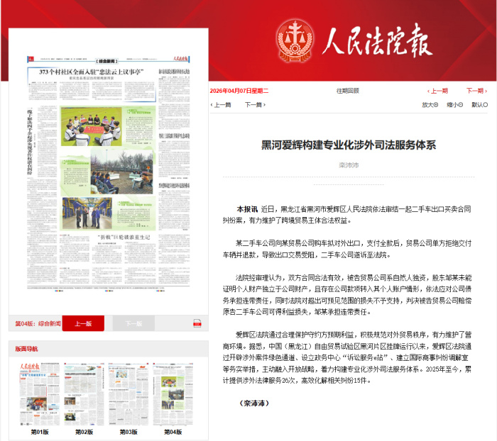 爱辉区法院通过合理保护守约方预期利益,积极规范对外贸易秩序,有力维护了营商环境。据悉,中国(黑龙江)自由贸易试验区黑河片区挂牌运行以来,爱辉区法院通过开辟涉外案件绿色通道、设立政务中心“诉讼服务e站”、建立国际商事纠纷调解室等务实举措,主动融入开放战略,着力构建专业化涉外司法服务体系。2025年至今,累计提供涉外法律服务26次,高效化解相关纠纷15件。