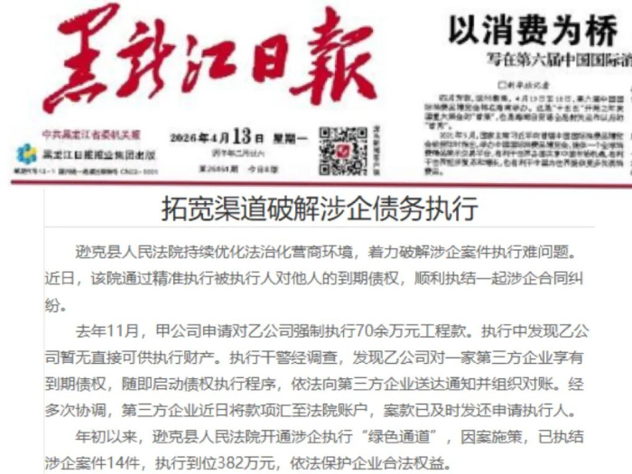 逊克县人民法院持续优化法治化营商环境,着力破解涉企案件执行难问题。近日,该院通过精准执行被执行人对他人的到期债权,顺利执结一起涉企合同纠纷。